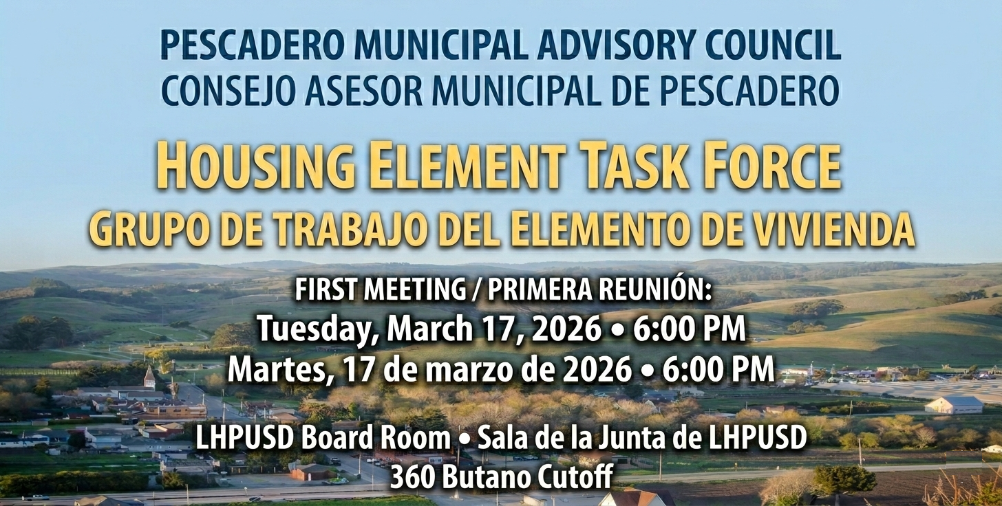 Back to All Events COMMUNITY: Pescadero Municipal Advisory Council Tuesday, March 17, 2026 6:00 PM 8:00 PM Google Calendar ICS PMAC holds one meeting a month, on the second Tuesday of each month. Council business begins at 6pm, and presentations from first responders, state, county, and local officials, and others, begin by 7pm. All meetings are open to the public.