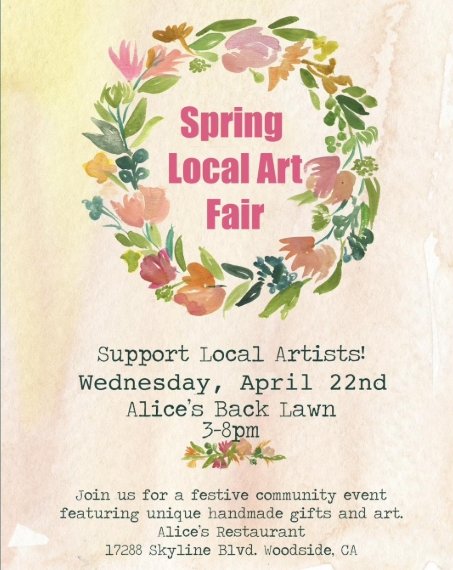 Mark your calendars for Alice’s first Spring Art Show this year featuring jewelry, pottery, paintings, etc. from our local artists.