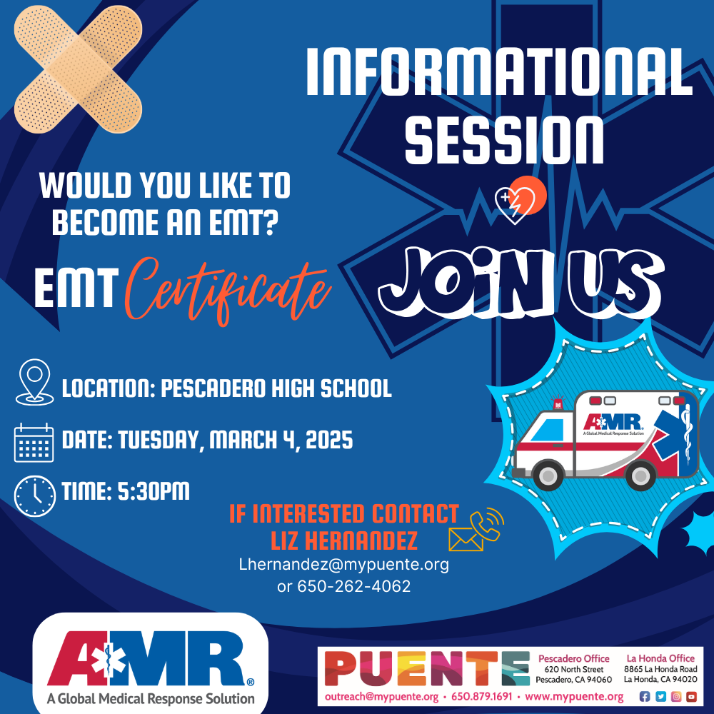 Back to All Events COMMUNITY: Becoming an EMT Information Session Tuesday, March 4, 2025 5:30 PM 7:00 PM Pescadero High School 360 Butano Cut-Off Pescadero, CA, 94060 United States (map) Google Calendar ICS Would you like to become an EMT? Puente is sponsoring an informational session providing details about the EMT certification process. Contact Liz Hernandez for more information: lhernandez@mypuente.org or 650-262-4062.