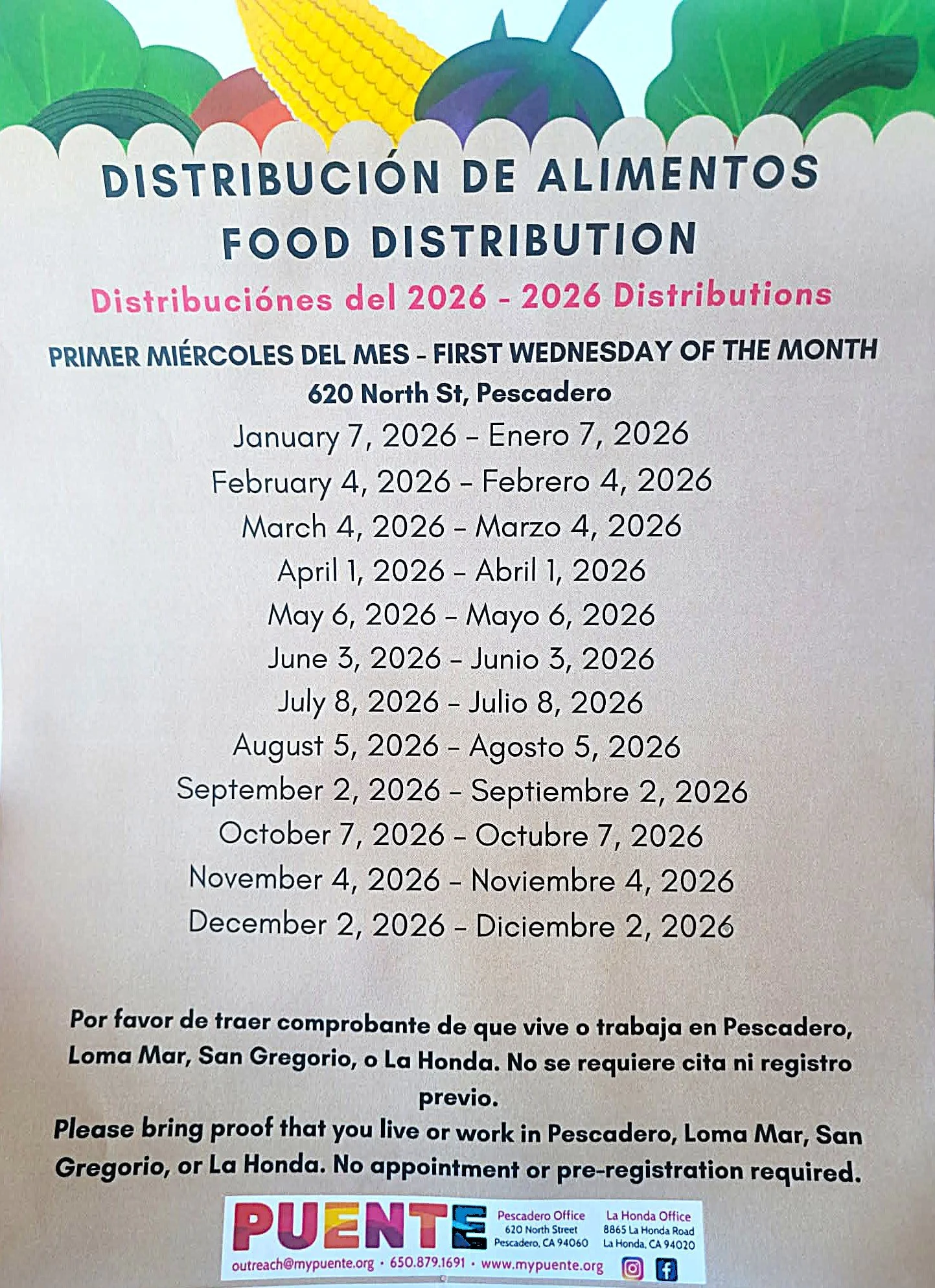 COMMUNITY: Food Distribution with Puente Wednesday, September 2, 2026 4:00 PM 6:00 PM Puente 620 North Street Pescadero, CA, 94060 United States (map) Google Calendar ICS